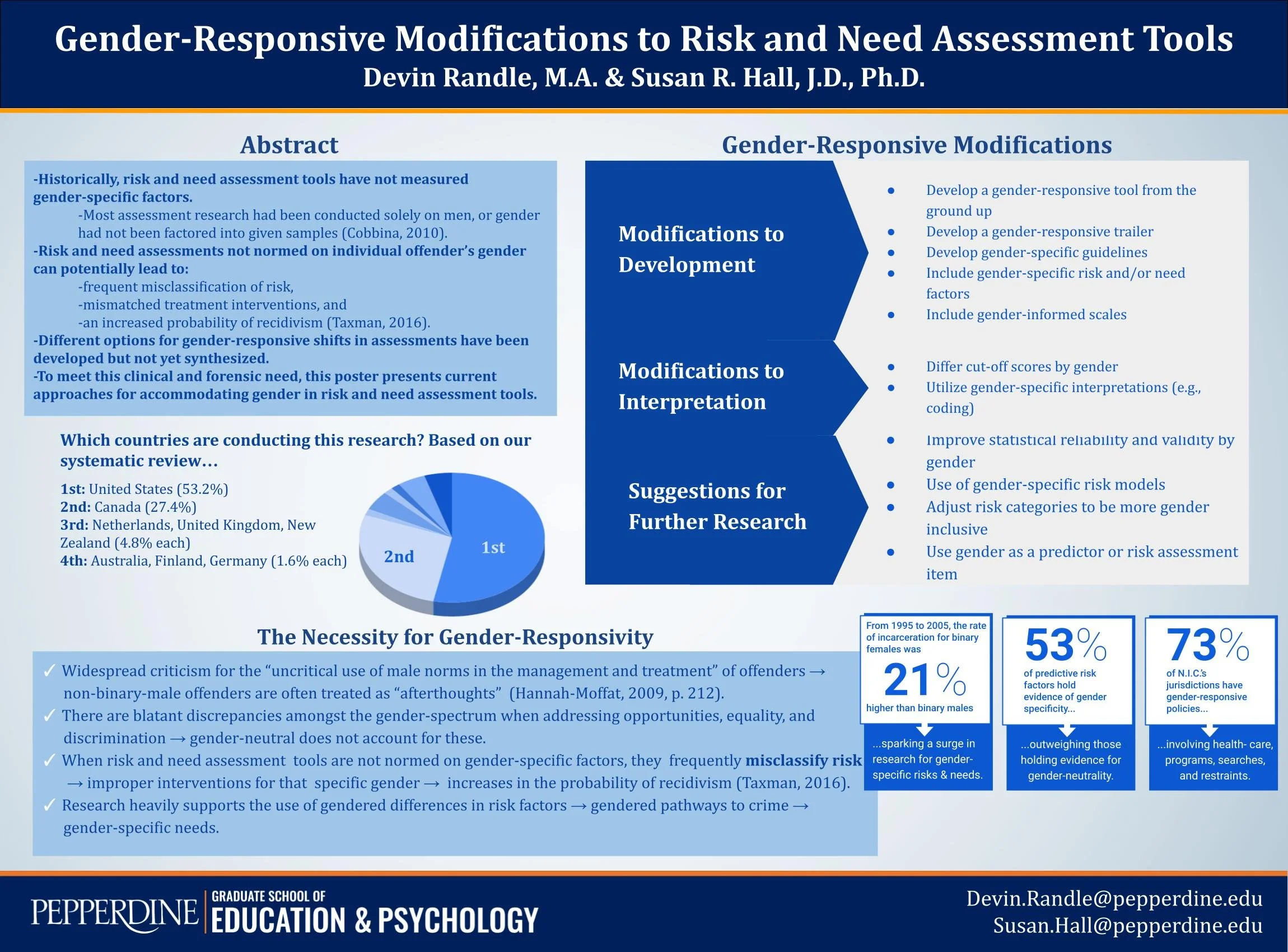 Historically, a majority of assessment research has been conducted solely on men or has ignored gender as an influential factor in given samples. As the female and non-binary offender population grows, this presents a problem. Clinicians have the responsibility to administer risk and need assessments with normative populations that match, or even consider, an individual’s gender. By utilizing tools that have been created or modified to consider gender, clinicians are minimizing the trauma that may be further instilled by inadequate assessments. The use of risk and need assessments that are not normed on the individual offender’s gender can often lead to misclassification of risk, mismatched treatment interventions, and an increased probability of recidivism. In response to this problem, different options for gender-responsive shifts in assessments have been developed; however, a detailed list of the relevant modifications and their associated assessments have yet to be synthesized in one place. While further research surrounding gender issues within risk and need assessment tools remains a necessity, this poster presents results from a systematic review detailing the different approaches for accommodating gender and the associated risk and need tools that have done so.