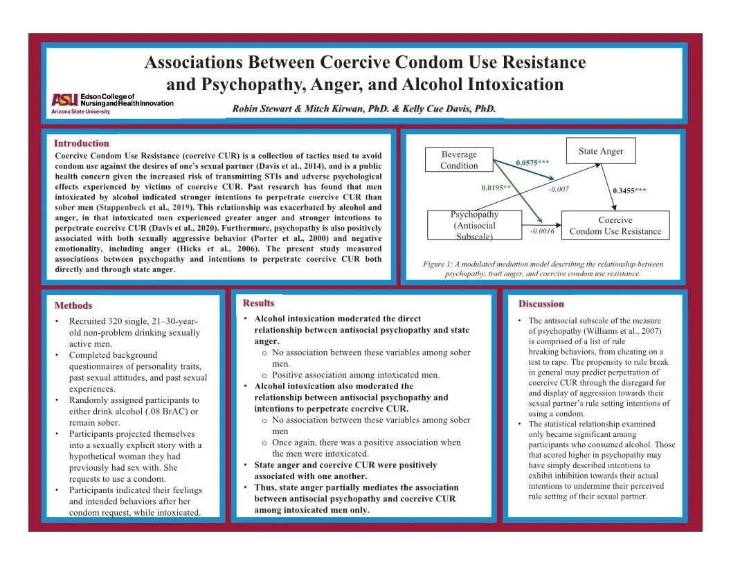 Coercive Condom Use Resistance (coercive CUR) is a collection of tactics used to avoid condom use against the desires of one’s sexual partner (Davis et al., 2014), and is a public health concern given the increased risk of transmitting STIs and adverse psychological effects experienced by victims of coercive CUR. Past research has found that men intoxicated by alcohol indicated stronger intentions to perpetrate coercive CUR than sober men (Stappenbeck et al., 2019). This relationship was exacerbated by alcohol and anger, in that intoxicated men experienced greater anger and stronger intentions to perpetrate coercive CUR (Davis et al., 2020). Furthermore, psychopathy is also positively associated with both sexually aggressive behavior (Porter et al., 2000) and negative emotionality, including anger (Hicks et al., 2006). The present study measured associations between psychopathy and intentions to perpetrate coercive CUR both directly and through state anger. Male nonproblem drinkers (N = 321) were recruited for an alcohol administration study examining the effects of alcohol intoxication and psychopathy on coercive CUR intentions using a sexual risk analogue. Through a moderated mediation model, results showed that alcohol intoxication moderated the direct relationship between antisocial psychopathy and anger, such that these two variables were not related among sober men (β = -0.007), but were positively related among intoxicated men (β = 0.0505***). Likewise, alcohol intoxication also moderated the relationship between antisocial psychopathy and intentions to perpetrate coercive CUR such that antisocial psychopathy was positively associated with anger when intoxicated (β = 0.0176***), but not when sober (β = -0.0016). Finally, there was a positive relationship between anger and coercive CUR (β = 0.3455***) indicating partial mediation among intoxicated men only. Future intervention programs seeking to reduce coercive CUR should consider targeting men high in antisocial psychopathy using anger reduction and alcohol use interventions.