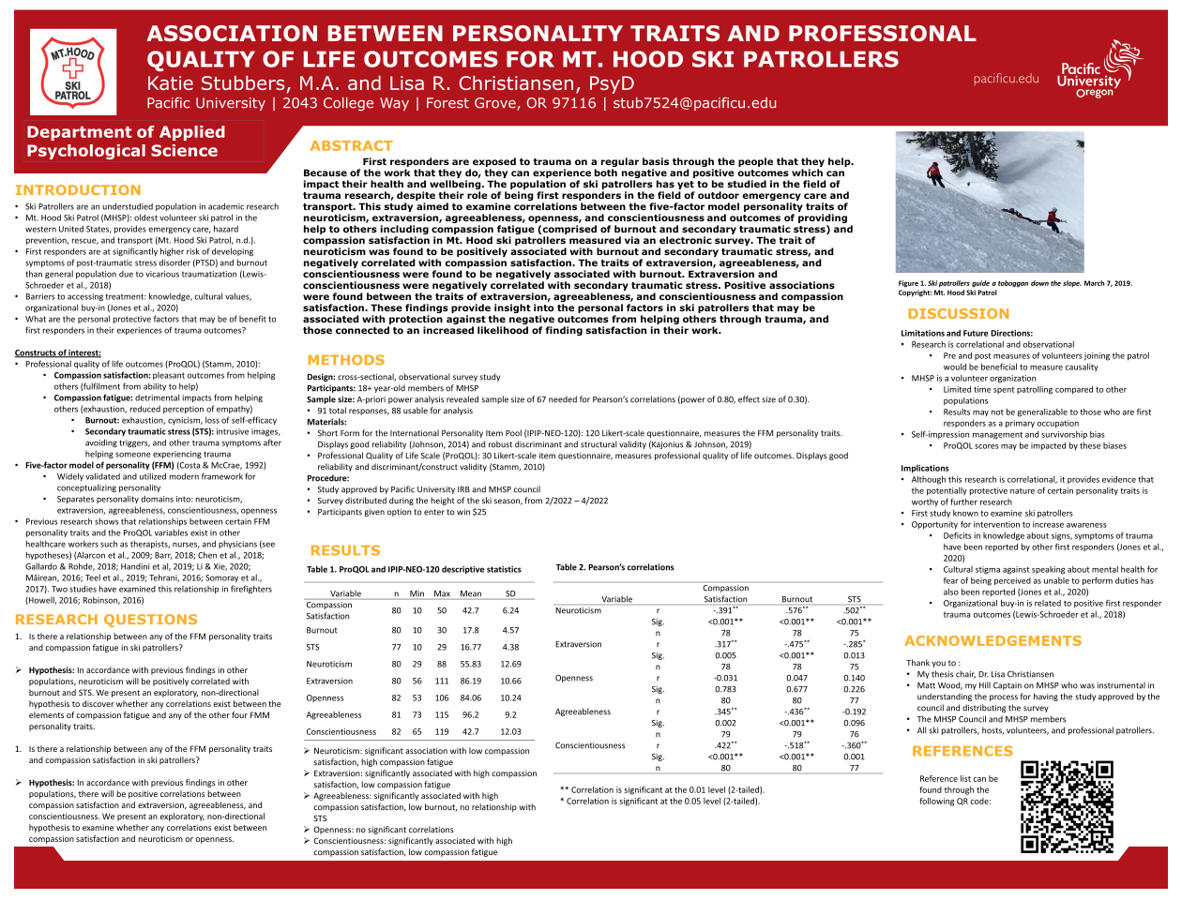 I am a student of Applied Psychological Science at Pacific University (PU) earning my master’s degree. I have been a volunteer as a first responder with the Mt. Hood Ski Patrol for two years, and have witnessed and heard firsthand accounts of the outcomes of vicarious traumatization experienced by patrollers and other first responders. For my thesis project at PU, I surveyed my fellow volunteer ski patrollers to gather data on the prevalence of both positive and negative outcomes from the work that we do, as well as personal factors that may contribute to increased risk or protection from those outcomes. During my time at PU, I also completed a practicum internship at the Domestic Violence Resource Center in Beaverton, Oregon where I provided trauma-informed individual and group psychotherapy to survivors of domestic violence.